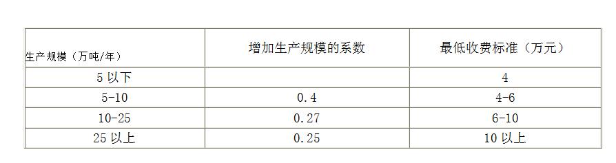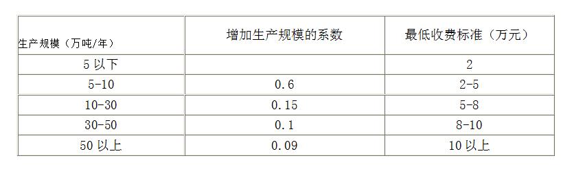 4.生產規(guī)模在區(qū)間內的項目評價費=收費標準+(項目的生產規(guī)模-表中相應的生產規(guī)模下限)×增加生產規(guī)模的系數。
